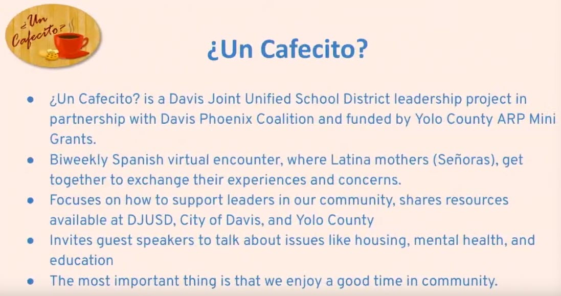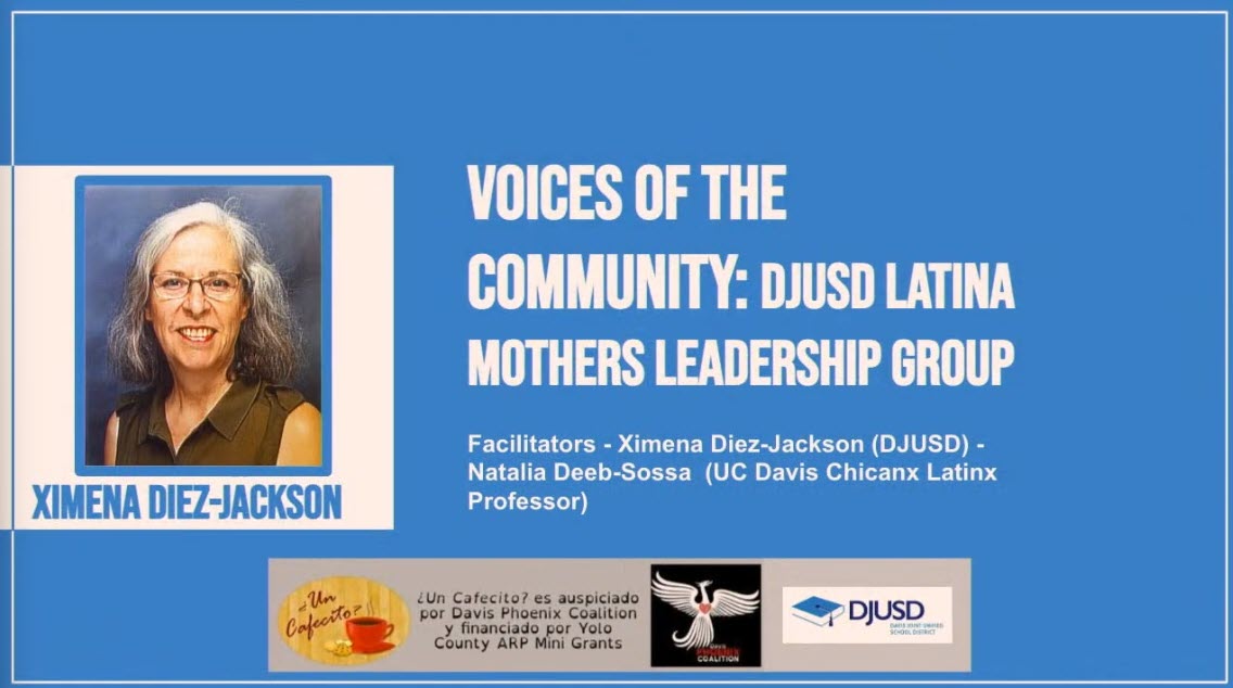I’m Ximena Diez-Jackson, Davis Joint Unified School District Coordinator of Language Justice and Family Partnership with UC Davis Professor Natalia Deeb-Sossa. We are facilitators of un Cafecito. Un cafecito is a DJUSD leadership project in partnership with Davis Phoenix Coalition and funded by Yolo County, ARP mini grants. It is a