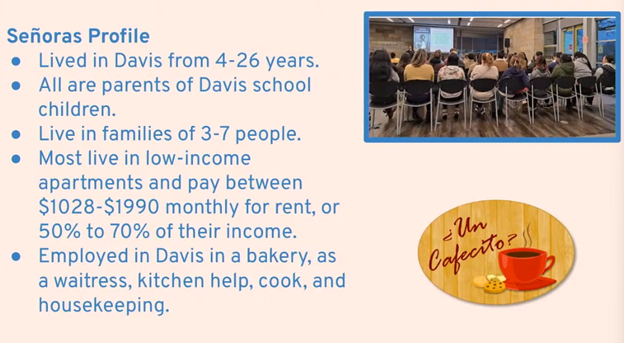 With Professor Deeb Sosa, we surveyed the señoras about housing in Davis. These are their answers. Señoras profile. They have lived in Davis from four to 26 years. All are parents of Davis schoolchildren. They live in families of three to seven people—most live in low-income apartments and pay between $1000 and almost 2000 monthly for rent, which is 50 to 70% of their income. They’re employed in Davis in a bakery as a waitress kitchen help, cook, housekeeping.