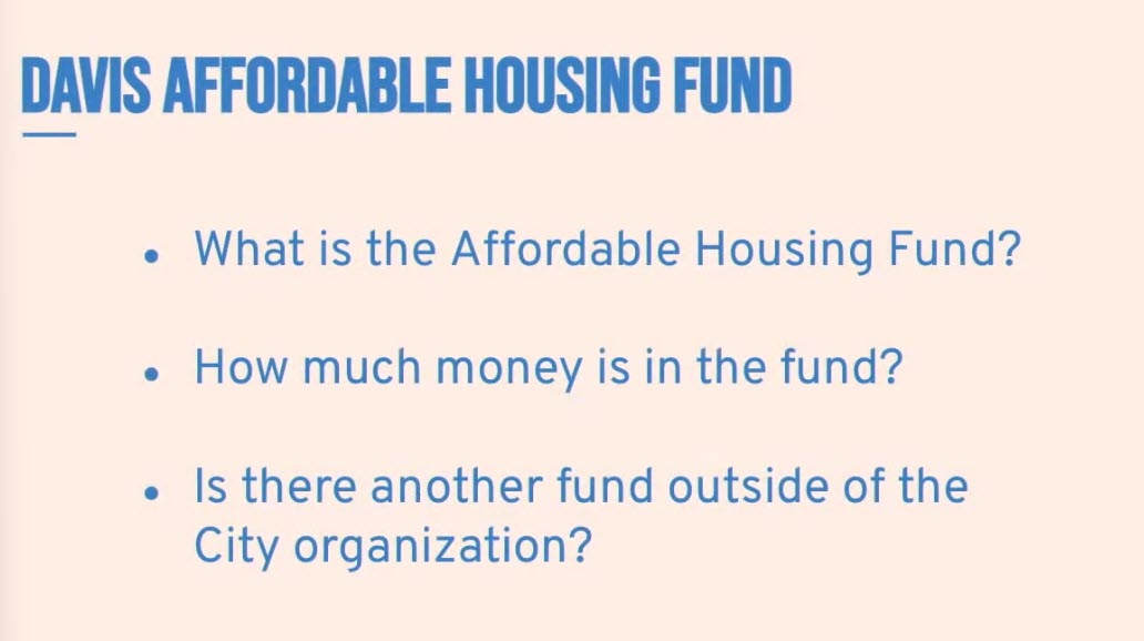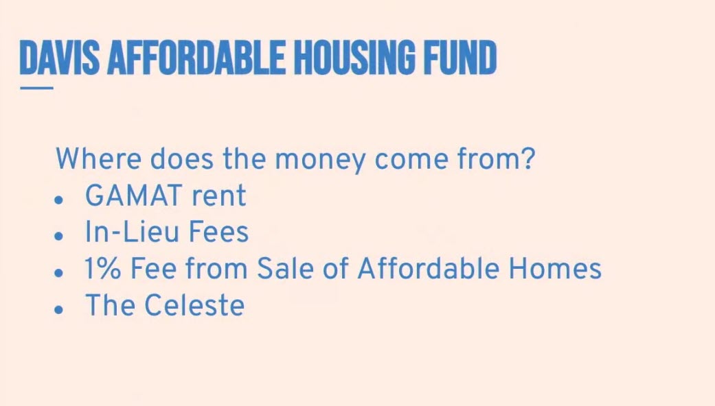 The city has something called an affordable housing fund. She called it a housing trust fund. Same idea, the city of Davis, has different buckets and those different buckets we put money into. And the different buckets have different requirements. Some are very fungible. So our general fund is money that we can use for any kind of governmental purpose of what the city does. So fire police, we could use it for housing, it can be used very widely. We have other funds that are very, very specific. For example, our wastewater fund, it’s only funded by rates and those rates have to go to pay for that utility. It cannot be used for anything else. So if we had extra money in our wastewater fund, we couldn’t just transfer it over and use it for affordable housing or any other purpose in the middle.