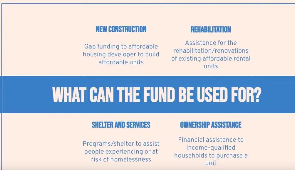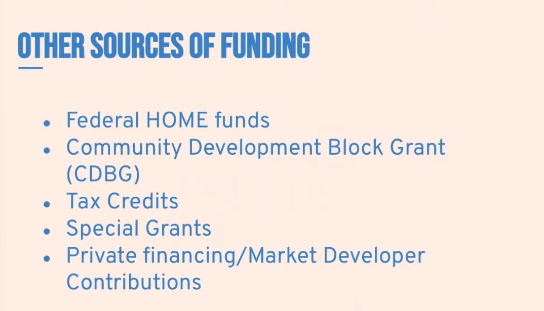 for ownership. Ownership housing for affordable levels. We have about $600,000 that’s not connected to anything right now. It’s able to be spent, but that’s it. But where do we get these dollars? Where do they come from?