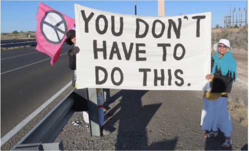 In a communique issued last April, the peace activists said, “This morning the West then Main Gate to Holloman AFB were blocked during the morning commute. Initially five peace activists blocked entry for 20 minutes to the West Gate of Holloman AFB using banners/signs stating: U.S. Drone Warfare is Terrorism; Holloman: Stop Training Drone Assassins!!!; No Tax $$ for Genocide.