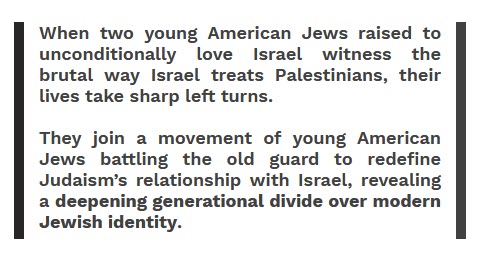 The award-winning film depicts the journey of two young Jews as they become increasingly uncomfortable at the contradictions between the values of their Jewish faith, their unquestioned loyalty to Israel and the brutal reality they witness firsthand of Israel’s occupation, and its impact on the indigenous Palestinian population. Through their personal courage to confront difficult questions, and by meeting and listening to Palestinians face-to-face, they find new ways to hold to their Jewish identity by standing in solidarity with Palestinians.