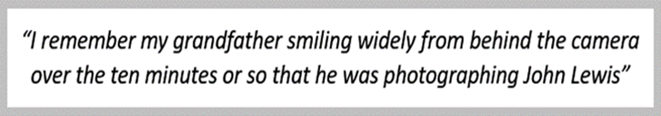 Miles recalled his grandfather’s elation at the Lewis photo session. “I remember my grandfather smiling widely from behind the camera over the ten minutes or so that he was photographing John Lewis.”