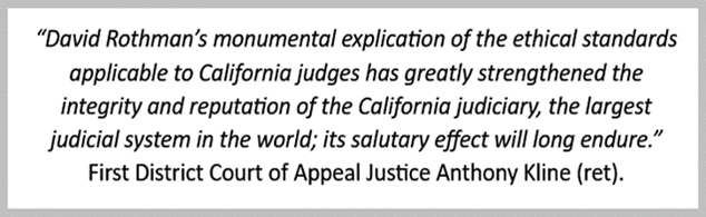 The California Judge Foundation designated Rothman’s work as the “undisputed treatise on judicial ethics.” Commonly known as “The Book,” or the “Rothman Book,” it is given to every new judge elected or appointed to the bench in the state, courtesy of the California’s Judge Association.