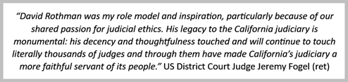 “David Rothman was my role model and inspiration, particularly because of our shared passion for judicial ethics. His legacy to the California judiciary is monumental: his decency and thoughtfulness touched and will continue to touch literally thousands of judges and through them have made California’s judiciary a more faithful servant of its people.”