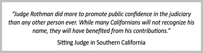 One public court judge in Southern California who participates in ongoing judge trainings where Rothman’s work is featured told the Vanguard on background, “Judge Rothman did more to promote public confidence in the judiciary than any other person ever. While many Californians will not recognize his name, they will have benefited from his contributions.”