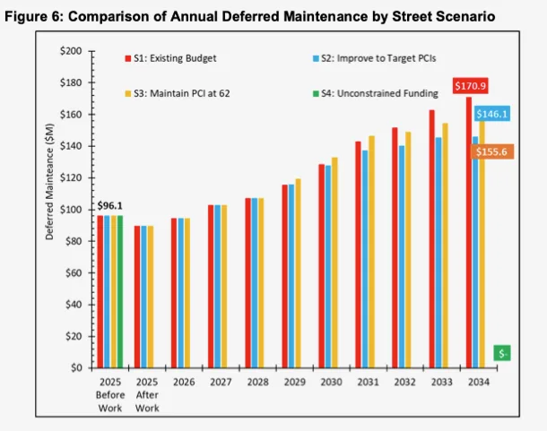Don’t take my word for it. Check out page 07-9 of the city staff report for the April 15, 2025 City Council discussion on the pavement budget. The graphic on that page documents that, right now, we have about a $90 million backlog in pavement projects. The cost of doing that work escalates dramatically, much faster than inflation, if we don’t increase the budget. If we don’t, the backlog grows to about $170 million by the year 2034. Exploding that backlog even further will have negative impact on all other General Fund supported programs, including the ones you mention.