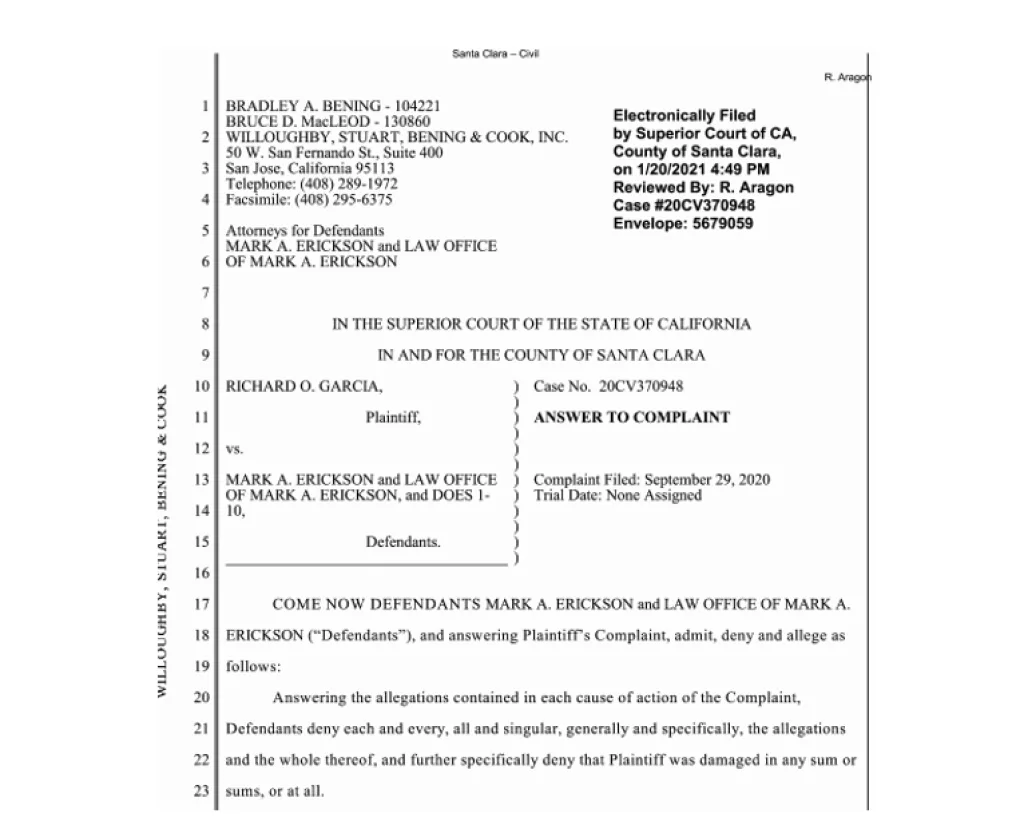 Now, in a lawsuit involving Erickson and his former elderly client, Richard Garcia, a jury will be asked to decide whether Erickson misled Richard into choosing a private judge—one Richard says steered his divorce in favor of his ex-wife and her lawyer, David Patton, of the law firm Lonich, Patton, Ehrlich, Policastri, costing Richard millions of dollars in unnecessary fees and costs.