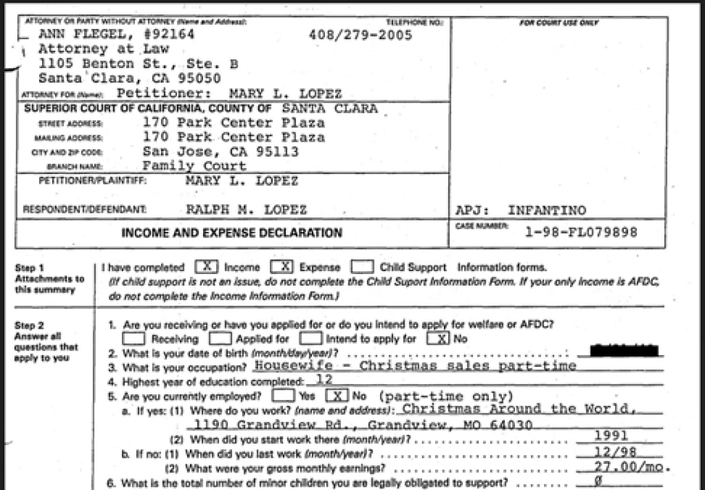 Income and Expense court document filed in Mary and Ralph Lopez divorce case that was final by 2001.