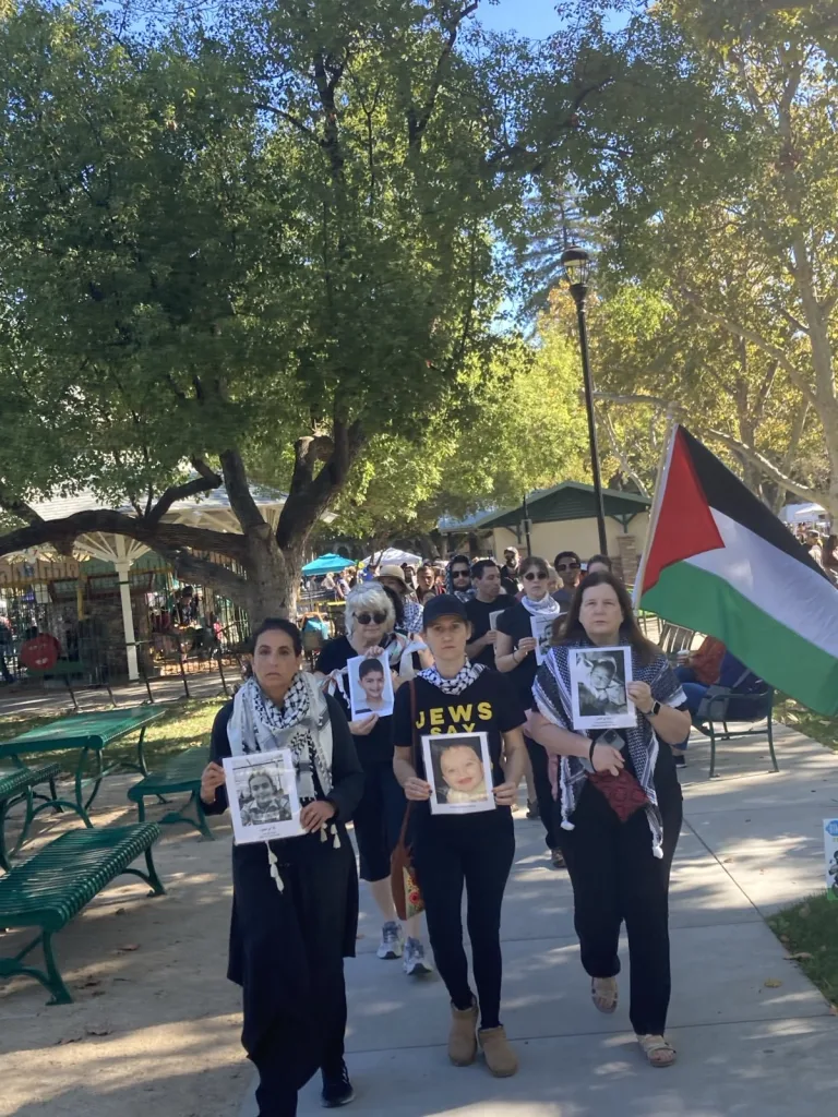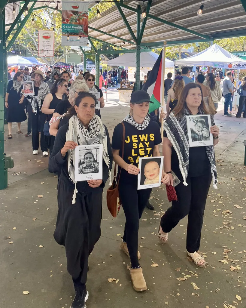 DAVIS, CA – About 50 people dressed in black marched silently through the Davis Farmers Market on Saturday, October 11, marking two years since the start of what organizers called a genocide in Gaza.