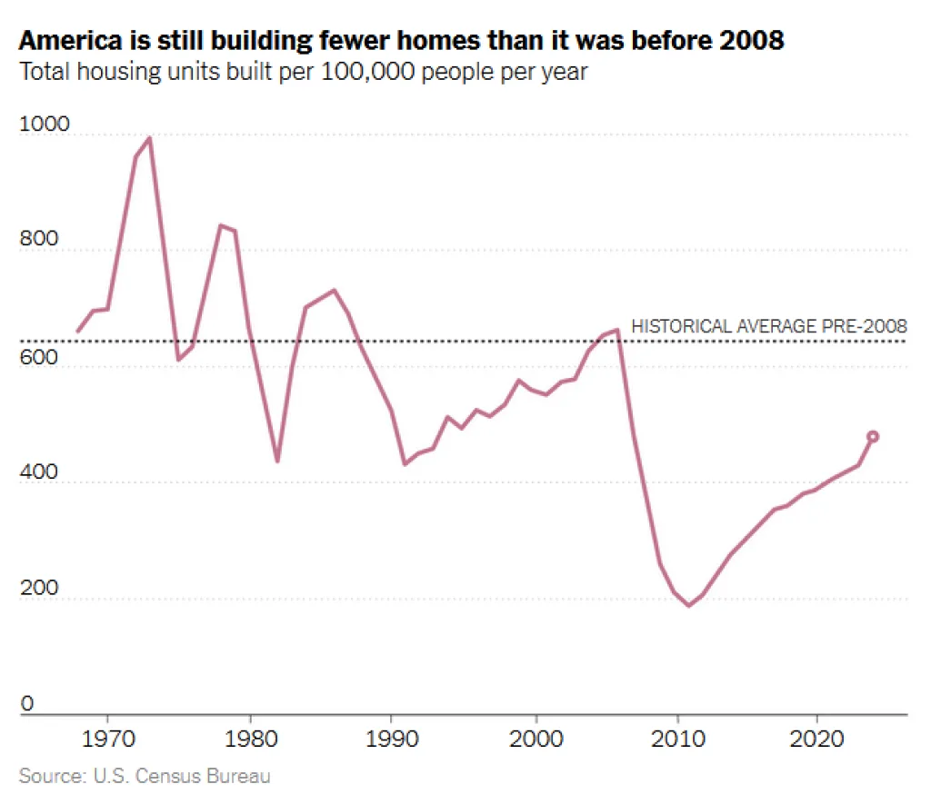 For Klein, the basic diagnosis is straightforward. “The core of the problem is simple: Too much money chasing too few homes,” he writes, citing estimates that the U.S. is short between 2 million and 5 million homes after decades of underbuilding. He points out that in 2025, America built fewer homes per 100,000 people than it did in 2005, 1995, 1985 or 1975.