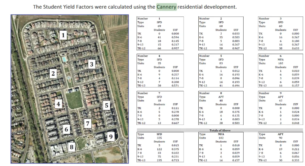 The Cannery’s numbers are important because they establish a local baseline. With roughly 600 units, the development has produced almost 300 students, an enrollment gain mapped directly through geocoded student data tied to housing parcels.