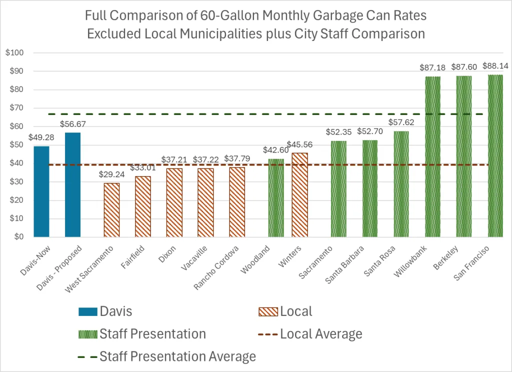 The rationale for that extension was based on misleading information presented by Staff to the City Council and ratepayers as to how Davis’ rates compare to surrounding communities. Staff’s rate comparison found that the City of Davis’ solid waste rates are lower than our surrounding communities when just the opposite is true. The City of Davis’ solid waste rates are among the highest in Yolo, Solano, and Sacramento Counties.
