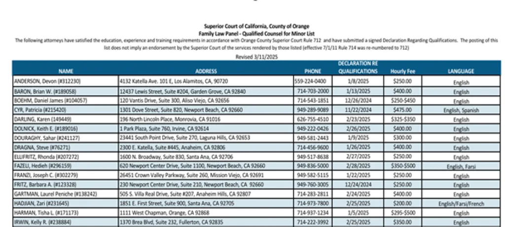 Partial List of Orange County Superior Court Minors Counsel Panel Shows