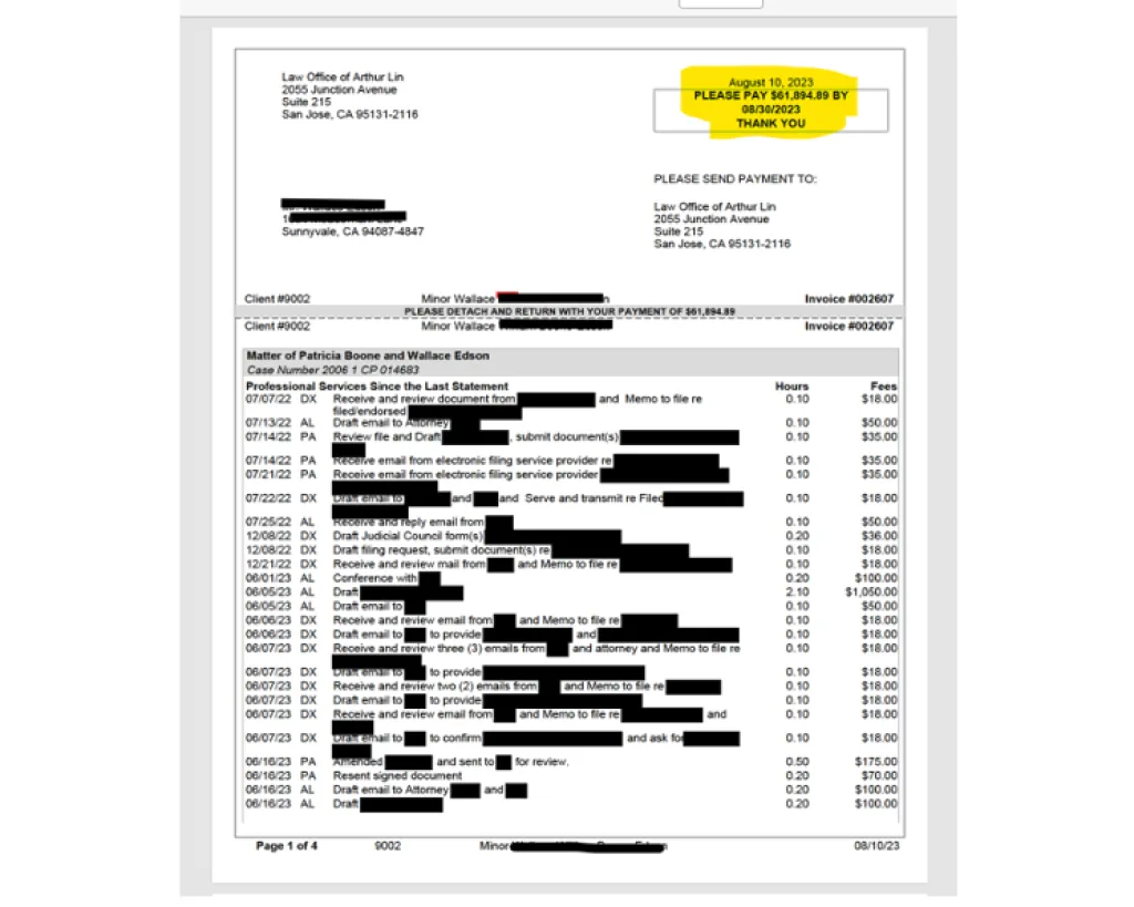 Court filings show Lin billed for efforts to shut down the mother’s legal fees crowdfunding campaign, strip her of custody, and obtain a lifetime restraining order against her weeks before her only son turned 18.