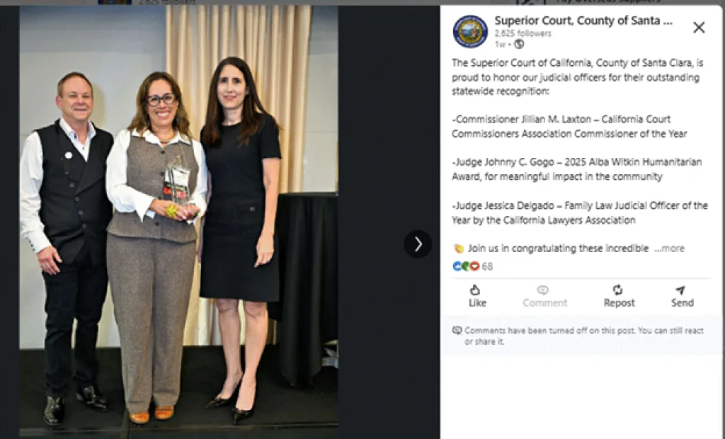 Minors Counsel BJ Fadem (left), Santa Clara County Superior Court Judge Jessica Delgado (center), California Supreme Court Chief Justice Patricia Guerrero (right). Screen shot from LinkedIn.