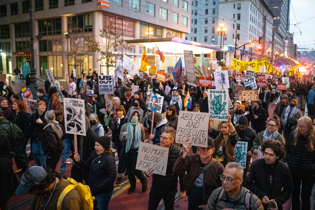 “In Venezuela, in Iran, in Ukraine, Greenland, Sudan, Congo, Yemen, Myanmar, tensions all over the world are ramping up,” said Aditya B of the Democratic Socialists of America’s San Francisco chapter. “We in the United States are not only experiencing violence and repression at home, but we know our corrupt government and military are responsible for escalating tensions and causing suffering of so many millions all across the globe. Our tax dollars fund this machine. So it’s pretty clear: we have to do something about it.”