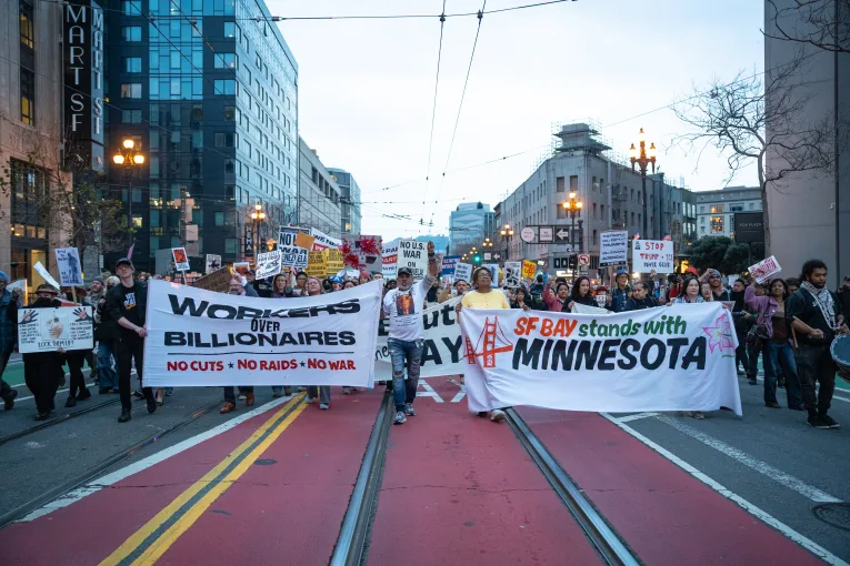 SAN FRANCISCO — On the one-year anniversary of President Donald Trump’s inauguration, thousands of Bay Area residents walked out of their schools and workplaces and marched through San Francisco on Jan. 20 to protest what organizers described as authoritarian rule, violence by Immigration and Customs Enforcement, and the administration’s escalating conflict with Venezuela.