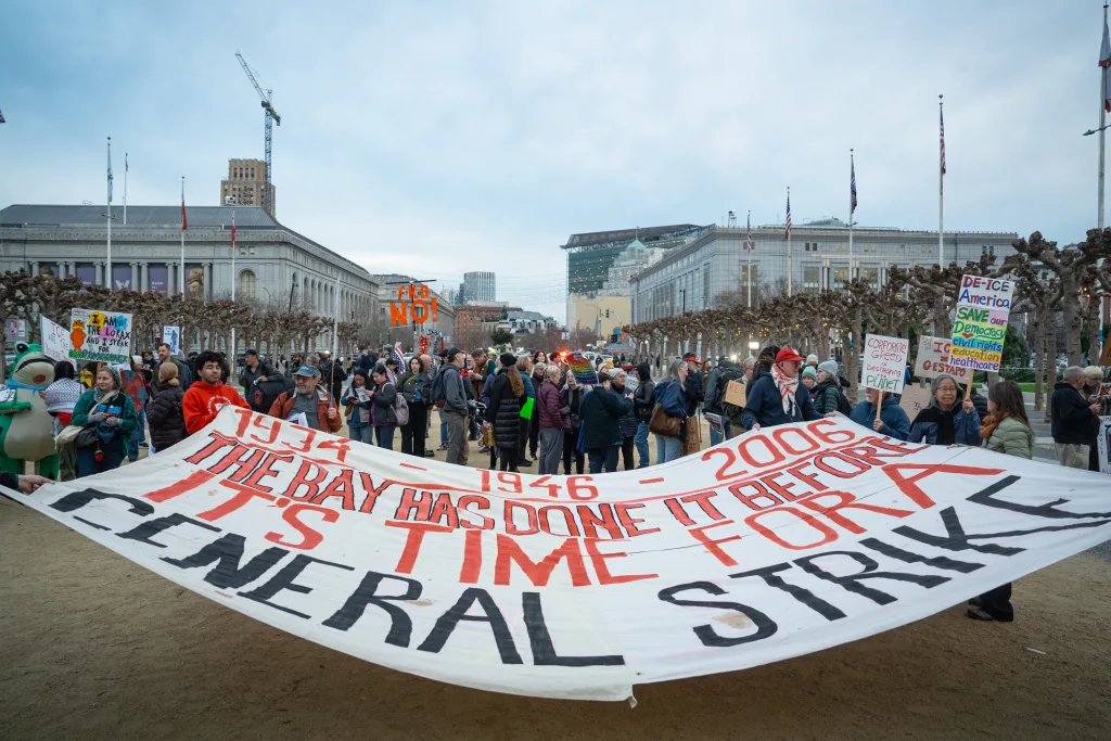 The action was organized by a coalition of grassroots groups including 50501 SF, Bay Resistance, Democratic Socialists of America chapters in San Francisco and the East Bay, Indivisible SF, the Party for Socialism and Liberation, the Peace and Freedom Party, the Bay Area Palestinian Youth Movement, Nodutdol for Korean Community Liberation, and United Educators of San Francisco.