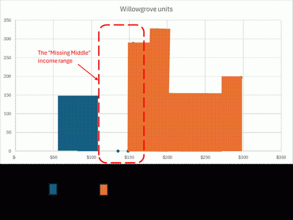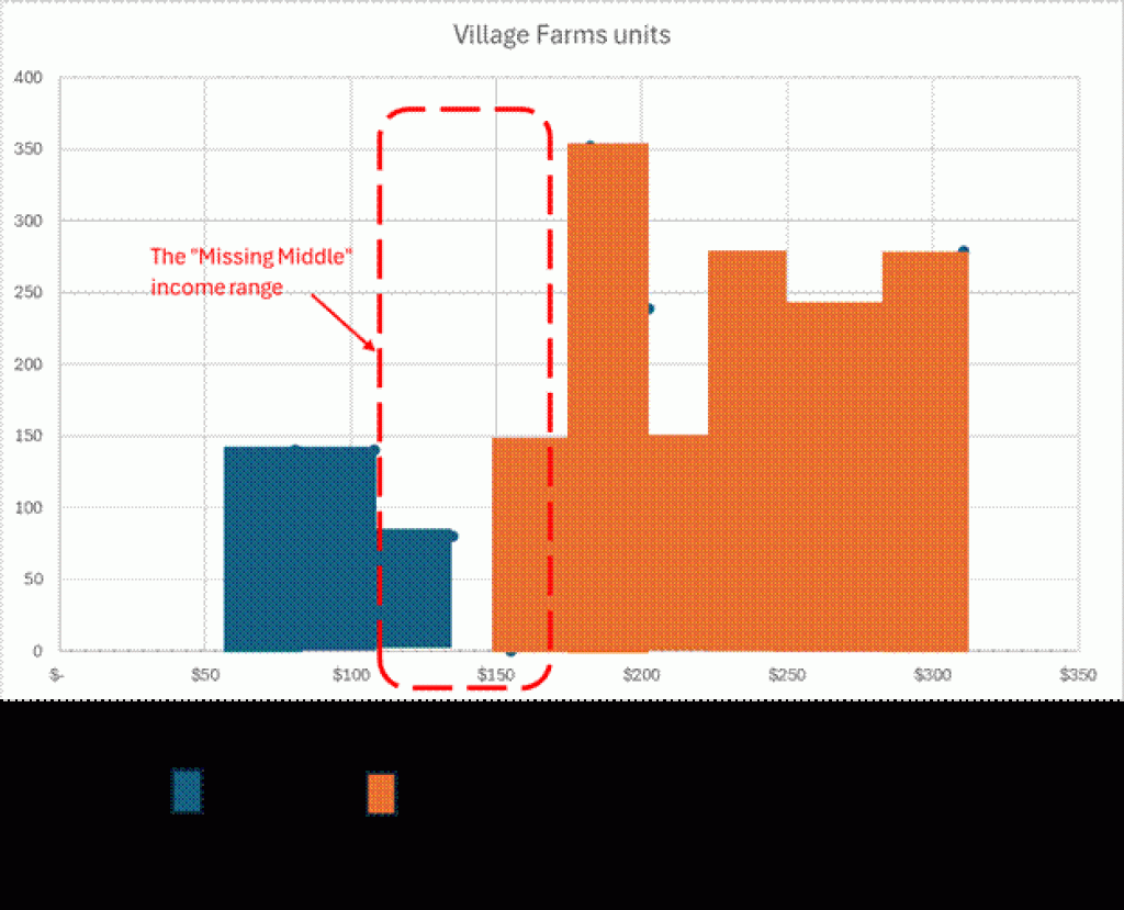 To be sure, both Village Farms and Willowgrove are providing some attached housing that presumably will sell for the low $600,000’s, affordable to households earning at least $150,000, but that is exactly what they are building the least of: just 12% for Village Farms and (definitely a better balance) of 23% for Willowgrove. Village Farms has just recently adjusted their Affordable (income restricted) housing figures by placing 80 units in the “Moderate Income”–affordable to 80-100% AMI– category, but Willogrove still appears to not be providing for that income range (it’s early yet and they may adjust). In any case, in order to serve the most young families with elementary-school aged children, we really should be pumping up the housing that the missing middle can afford, but that’s not happening.