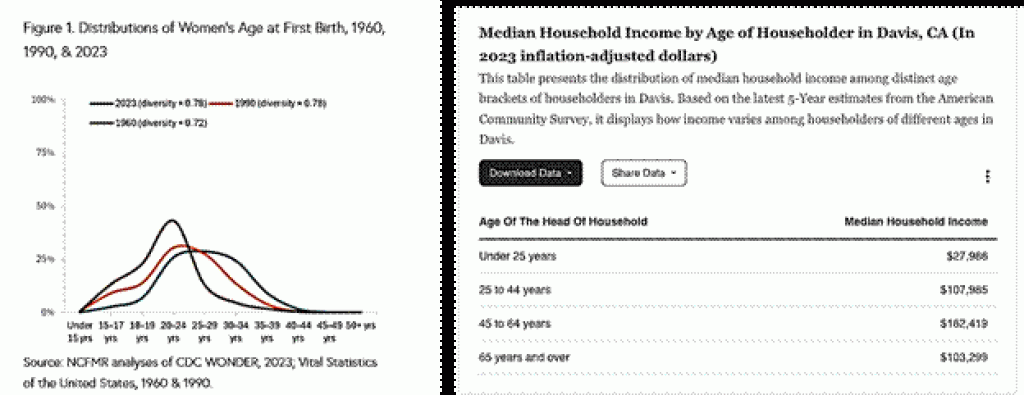 And there are good data sets that correlate the age of women to when they have their first child. This age has been increasing over time, and today there’s a wide plateau between the mid-20’s to mid-30’s, but still falling off by 40 (see below). The average mother’s age at first birth is 27.6 years and for all births is 30.6 years.