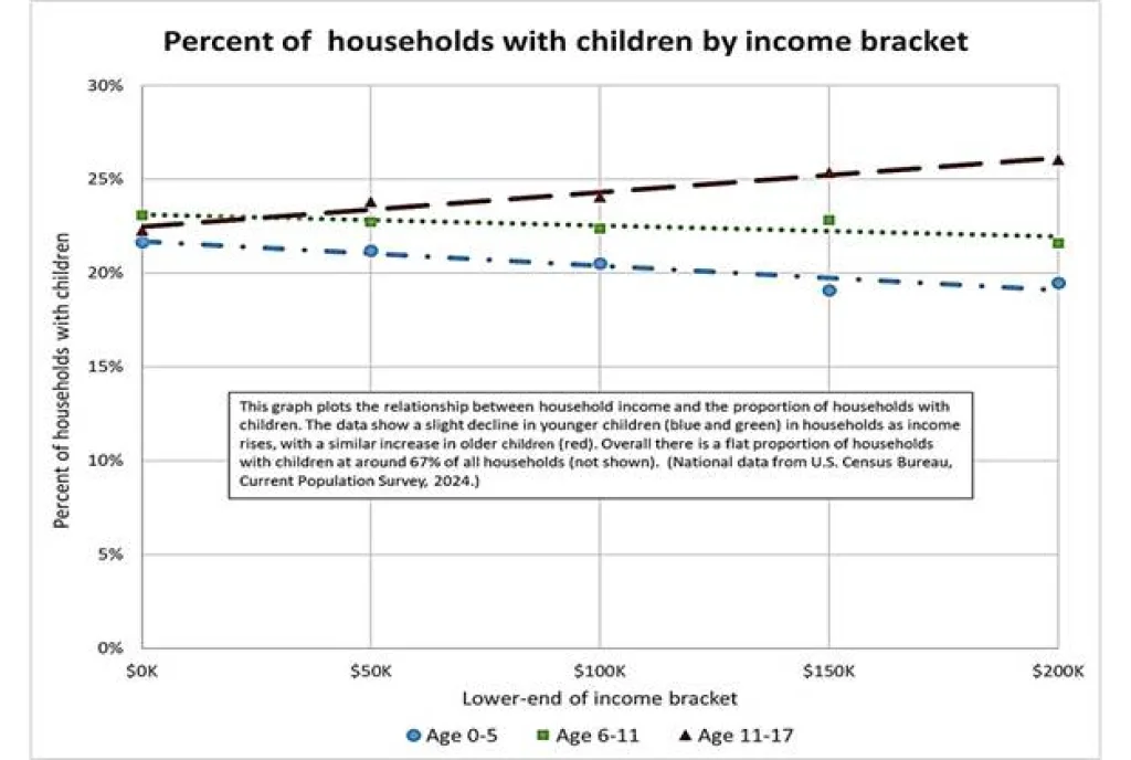 The District would have more sustainable enrollment if new students are elementary-school aged, as they will also be likely to remain in Davis schools through high school. Digging further into the national data correlating children’s age with household income (see below, from national statistics), the trend is clear that higher incomes bring more older children and fewer younger ones.