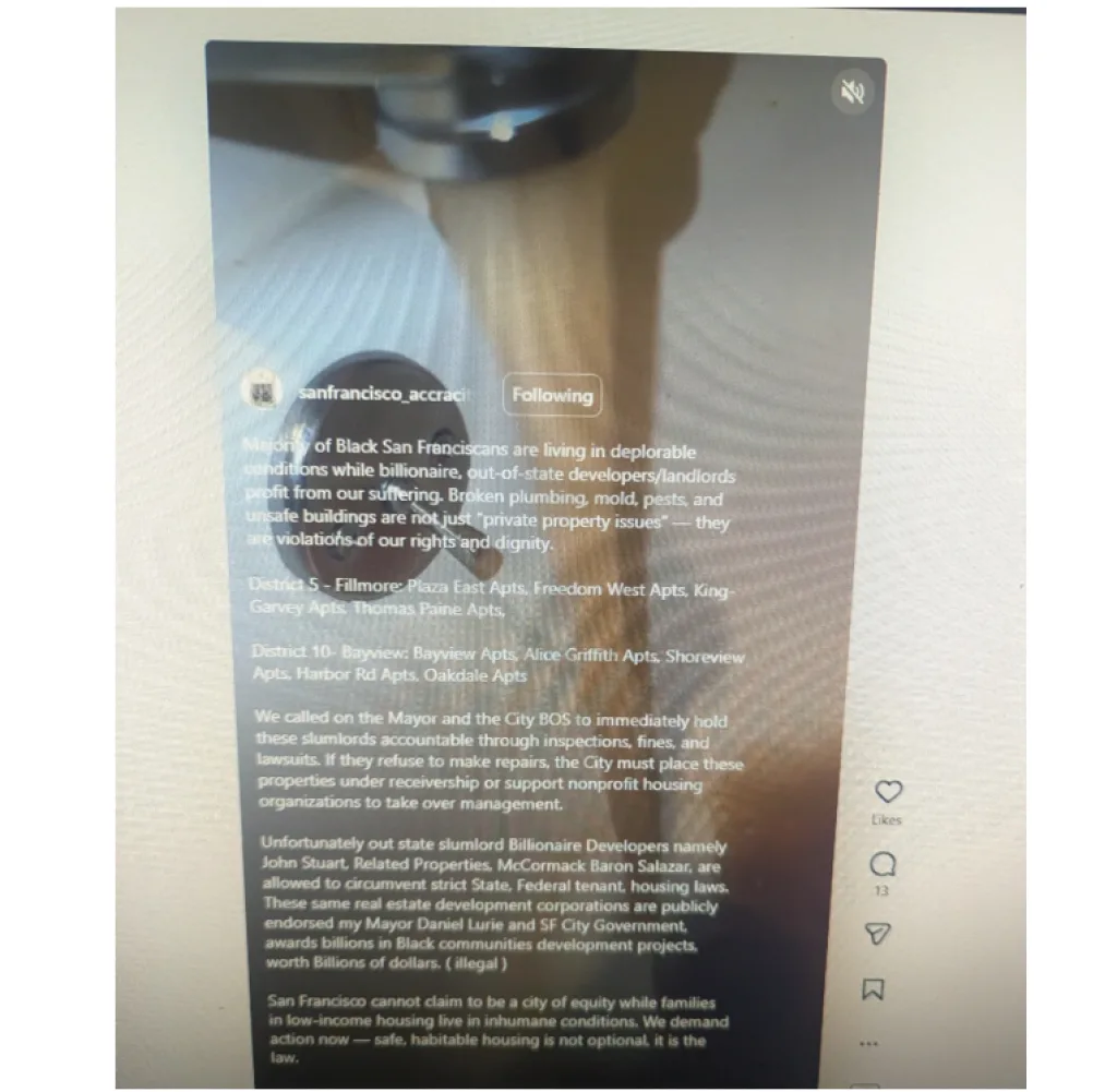 I often remind people that on top of being a journalist, I am an activist-minded US Army veteran. Freedom of speech and the exercise of all Constitutional rights are very dear to me. I want to let all landlords and the City and County of San Francisco know that the State of California has policies, laws, and protections in place for tenants when they peacefully speak out about habitability issues and other various topics they encounter when dealing with corporate landlords like Related California and John Stewart. If you think that I am not instructing my fellow community members of their rights, you’re wrong. Retaliation for the exercise of free speech will not be tolerated.
