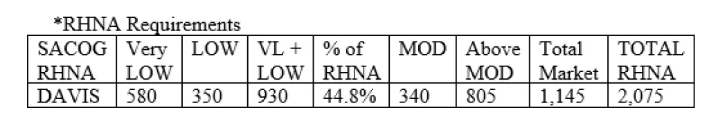* I Have placed the Regional Housing Needs Allocation (RHNA) numbers in a table at the end of this article. Clearly, Davis is most deficient in creating Very Low Income (VLI) and Low Income(LI) units