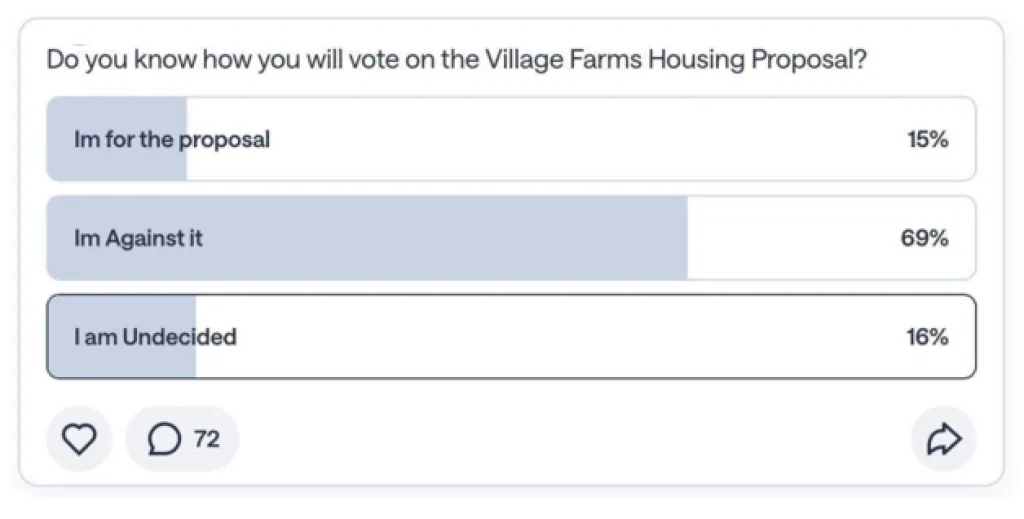 A recent poll on Nextdoor has shown that the Village Farms proposal is already deeply unpopular and statistically has no chance of passing.