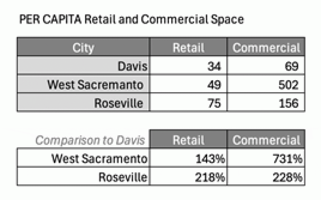 West Sacramento has 43% more retail space per person, and 7 times more commercial space. Roseville, a regional shopping hub, has more than twice retail AND commercial space per capita.