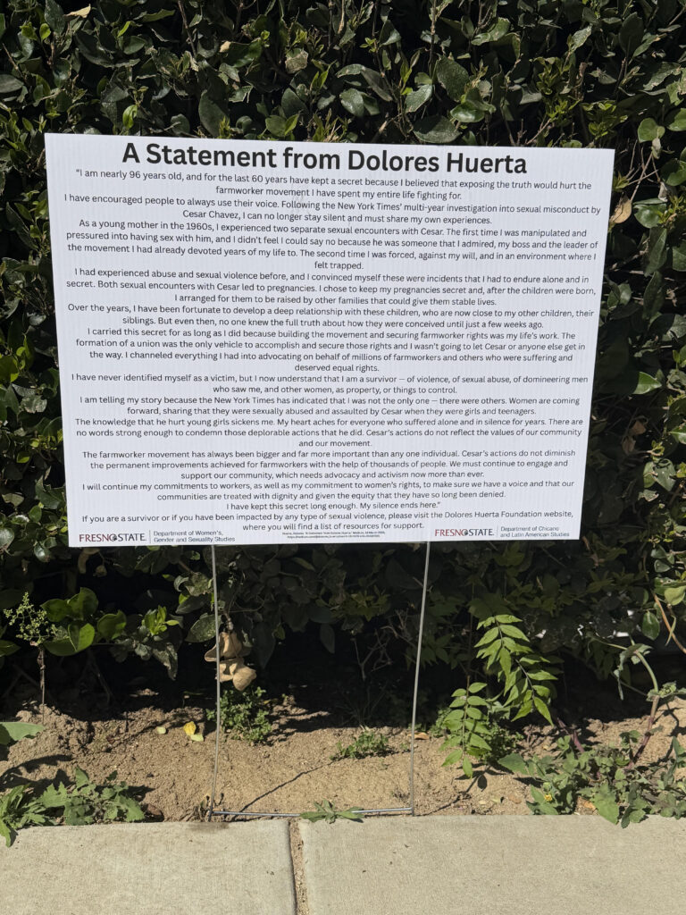 A day after Fresno State removed a statue of César Chávez, signs appeared nearby highlighting sexual abuse allegations against him — part of a broader reckoning unfolding across California schools.