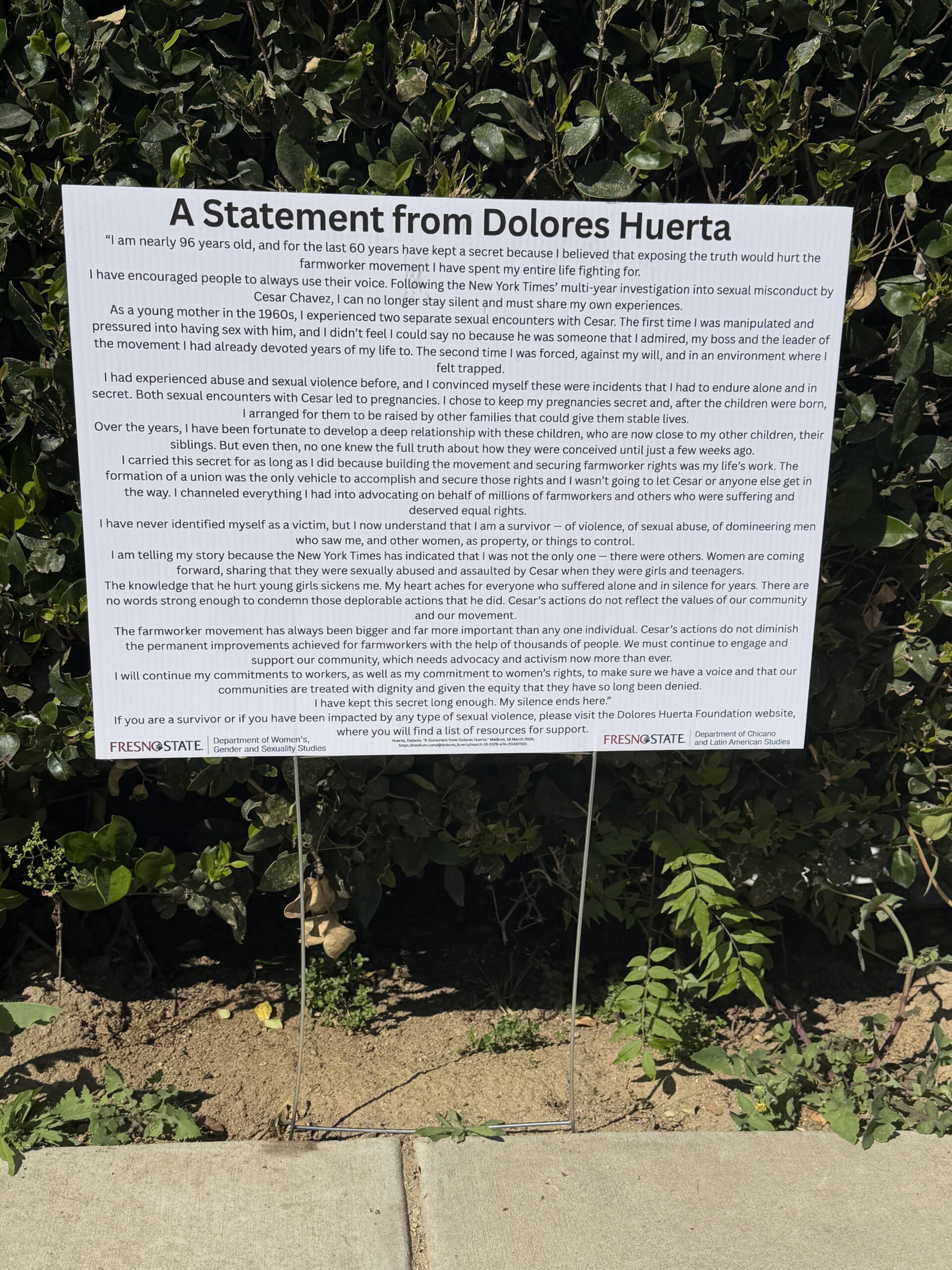 A day after Fresno State removed a statue of César Chávez, signs appeared nearby highlighting sexual abuse allegations against him — part of a broader reckoning unfolding across California schools.