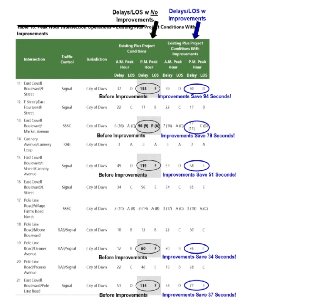 2) Claims of Extreme Adverse Traffic Impacts of the Project on Surrounding Streets – Project opponents also speak of a traffic Armageddon resulting from the Project. In their REBUTTAL TO ARGUMENT IN FAVOR OF MEASURE Vthat will be on the June ballot, they claim, “It would bring over 15,000 more car trips DAILY near Covell Blvd. and Pole Line Road causing gridlock and Level of Service “F.”