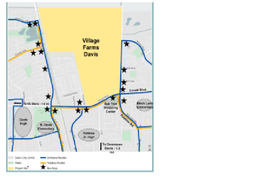 3. Public Transit Access – Plus, the location of Village Farms Davis is immediately adjacent to or within a short walk of 18 existing dedicated bus stops for six Unitrans routes (E, F, L, P, Q, and T) and two Yolo Bus routes (43 and 230). There is no other location in the City where 1,800 units might otherwise be built that offers this many public transit options and close proximity to so many local destinations.