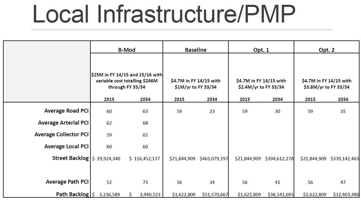 The B-Modified version is $25 million up front and more money per year than the other options, Mayor Krovoza pointed out. Some of the parcel tax would need to be sufficient to meet not only the bonding, but the yearly expenditures. B-Mod takes the city’s PCI from 57 upwards toward 63.