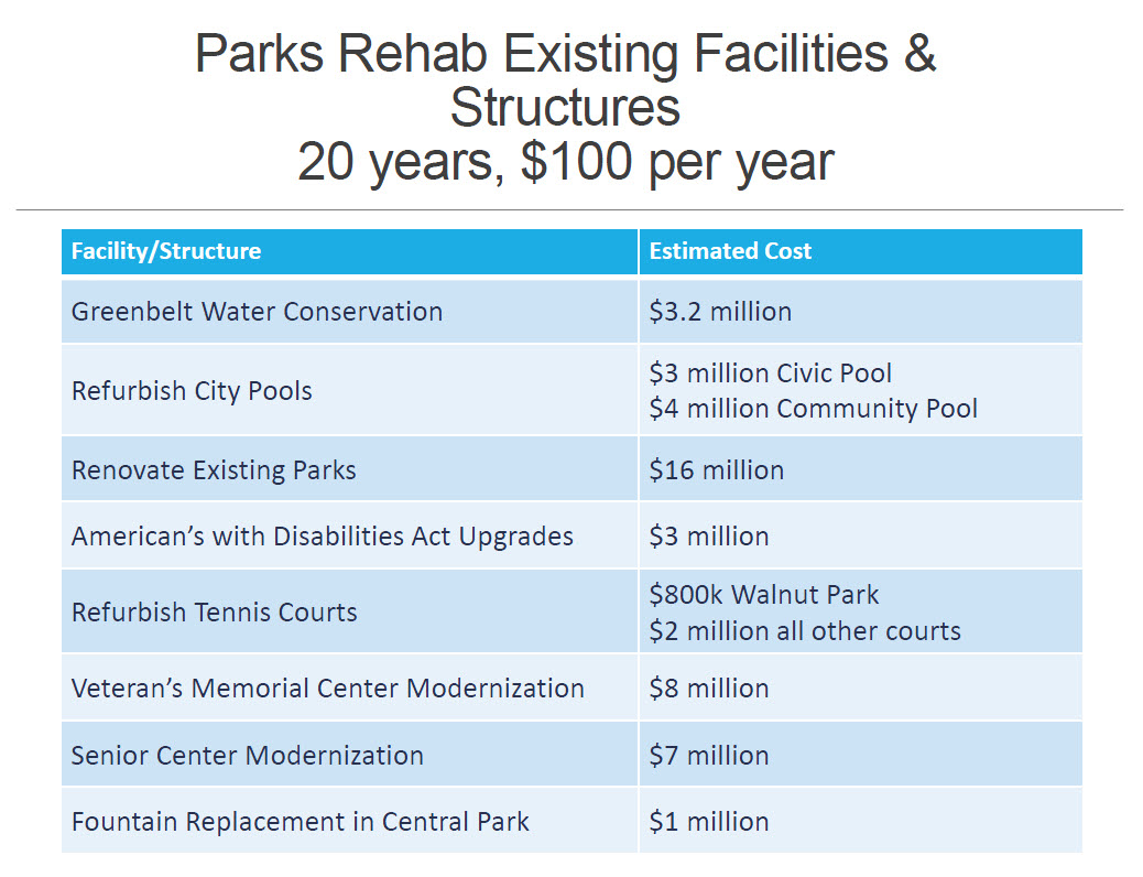 “I do agree that there are items on this list of parks facilities that are nice, but they are things that I don’t think are as critical as others,” he continued. “I think I’m willing to go without some of these.”
