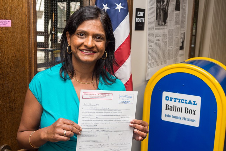 Meet school board candidate Madhavi Sunder at an informal gathering this Sunday, November 2, from 3 to 5 p.m. hosted by former Davis Mayor Ken Wagstaff and his wife Diane. Also at the Wagstaffs home will be school board candidates Barbara Archer and Bob Poppenga. Introducing the three candidate will be City Council member Brett Lee. To RSVP (and to obtain the house address), please email SunderForSchools@gmail.com.