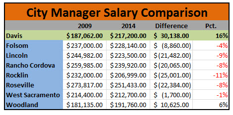 A quick glance at seven of our regional neighbors shows that Woodland was the only other city besides Davis to increase its city manager salary since 2009. Woodland increased the salary following the hire of Paul Navazio, from $181,135 to $191,760, just over a $10,000 raise or a six percent increase. Davis’ increase is nearly three times that.