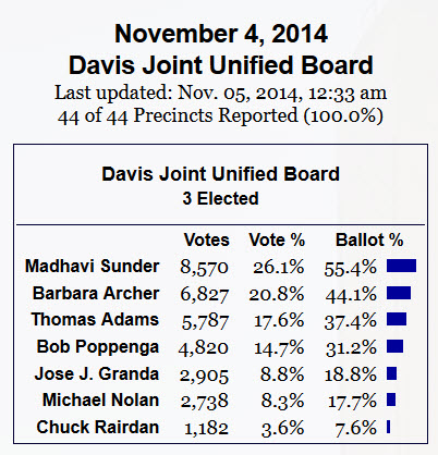 Or perhaps the other board members will look at her vote totals, and the breadth of her support across all parts of Davis, recognize that AIM is a popular, successful, and effective program, and leave it alone. If it isn’t broke, don’t try to ‘fix’ it.