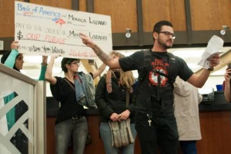 A group of about 30-40 students and workers had initially planned on going inside the Bank of America to present a giant check made out to Monica Lozano for “our future.” Once we arrived at the bank, however, we were spontaneously joined by dozens of additional marchers, making for about 75 people all spilling into the bank’s lobby. We wanted to call attention to the direct connection between the recent decision to increase tuition and the general trend of what is called privatization – the increased influence of private corporations and banks on universities. As the UC becomes more and more privatized, we have seen education become less accessible to the public. Higher education, unlike K-12 education, is no longer a right according to this trend, and if someone wants to attend a UC, it is their responsibility (and not the state’s) to pay for it. By occupying the bank, we wanted to call attention to the corporate banking industry’s stranglehold on public education.We also wanted to call attention to the fact that the banks — and their UC Regent directors — directly profit from the $1 Trillion (and rising) in loans we students have to take out to pay for our education.