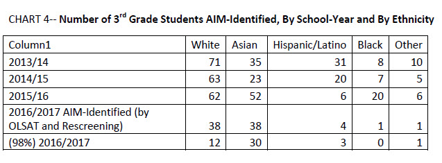 The 3rd grade AIM identification for next year, implementing the elimination of private testing, the continued use of OLSAT (Otis-Lennon School Ability Test) with specific risk factors and testing apparatus for re-testing alone without even implementing the most controversial part of the reform, and the increased threshold for qualification scores, shows a dramatic drop in both the number of students identified as well as the number of Latinos and blacks.