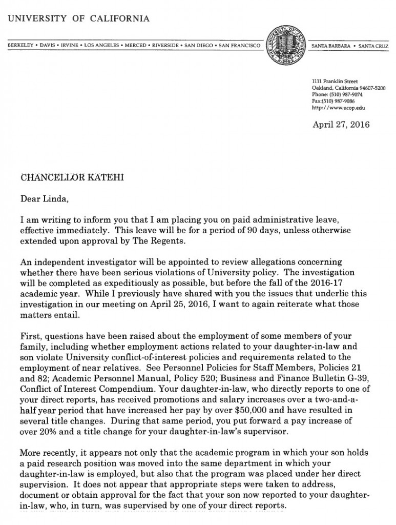 The statement began, “Information has recently come to light that raises serious questions about whether Chancellor Katehi may have violated several University of California policies, including questions about the campus’s employment and compensation of some of the chancellor’s immediate family members, the veracity of the chancellor’s accounts of her involvement in contracts related to managing both the campus’s and her personal reputation on social media, and the potential improper use of student fees.”