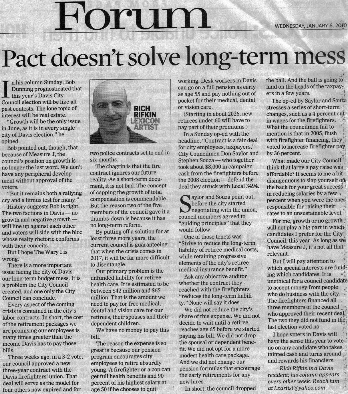 The city of Davis announced that the city had reached a tentative agreement on a three-year labor contract with the firefighters’ union, Local 3494. The proposed contract was on the city council’s agenda for ratification on December 15. The contract included a decrease in salary over the next three years, including a 6 percent decrease over the REMAINDER of the current fiscal year, with, in July of 2010, the salaries to be reduced by 4 percent over the current salary and, in July 2011, a 3 percent reduction from current salaries. Vanguard analysis determined the contract fell well short of the savings needed and it allowed for no period for public vetting.
