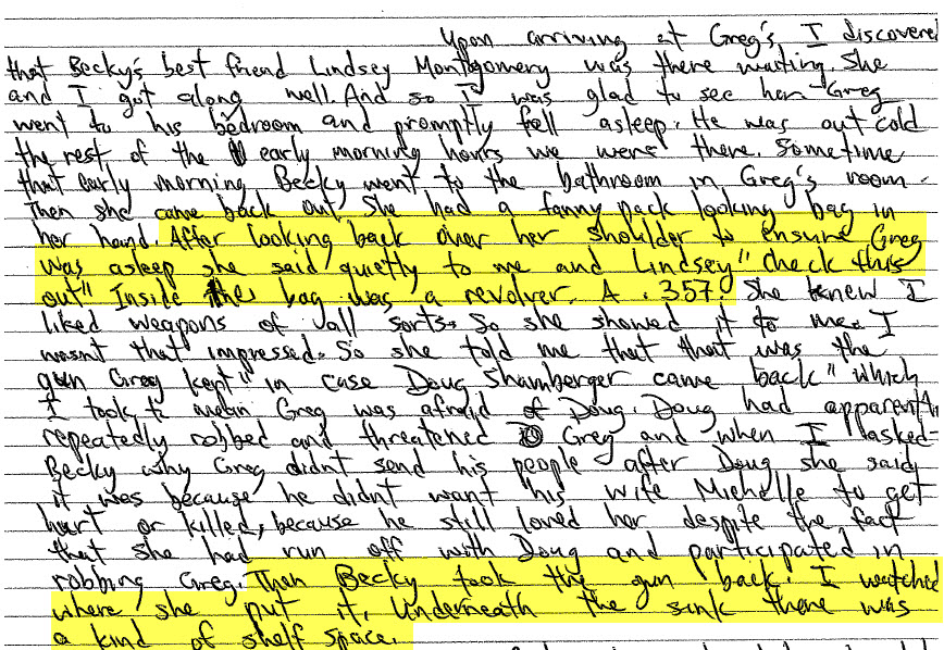 In a key detail, he described Becky Pina going to the bathroom in Greg Zielesch’s place. “Then she came back out. She had a fanny pack looking bag in her hand. After looking back over her should to ensure Greg was asleep she said quietly to me and Lindsay “check this out.” Inside the bag was a resolver. A .357. She knew I liked weapons of all sorts. So she showed it to me. I wasn’t that impressed. So she told me that that was the gun Greg kept ‘in case Doug Shamberger came back’ which I took to mean Greg was afraid of Doug.”