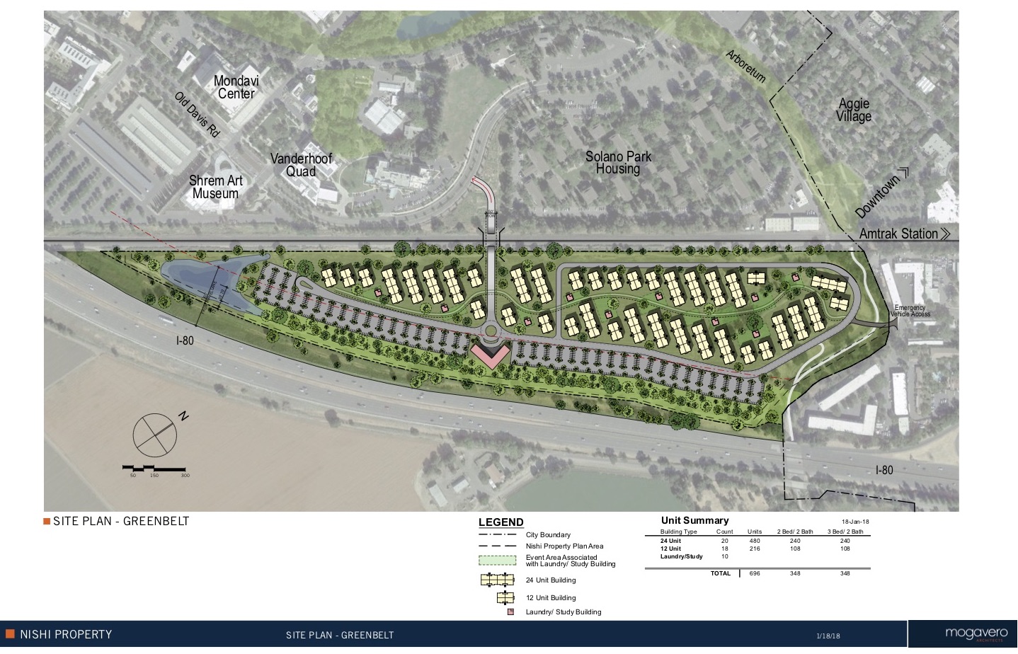 In October, the property owners submitted a preliminary conceptual plan. Staff explains, “The proposed concept would be generally consistent with the ‘Nishi Property – Option with Access Via UCD Only’ site recommended for housing in the City Council’s 2008 resolution regarding Housing Element Steering Committee recommendations. The City Council authorized environmental review and directed the proposal be scheduled for Commission review, under a schedule that would allow Planning Commission and City Council hearings in January-February 2018. This schedule would give the City Council the ability to place the project on the June 2018 ballot if it so chooses.”