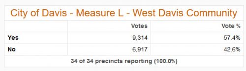 Alan Pryor issued a statement this morning: “The No on Measure L campaign worked very hard to inform the community about the proposed West Davis Active Adult Community development. However, Davis voters have approved Measure L by a substantial margin.”