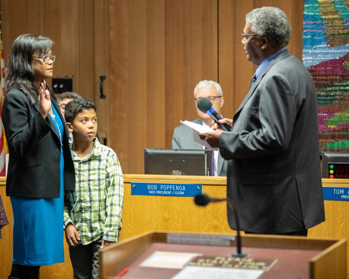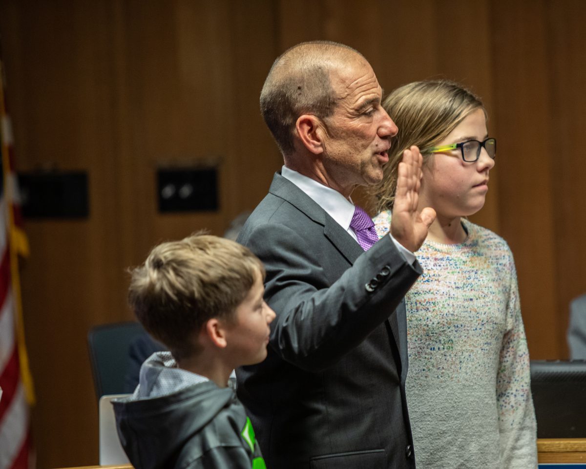 Joe DiNunzio sworn in by his wife standing with his two childrenTom Adams was sworn in by Superintendent Elect Tony Thurmond standing next to his wife and daughter