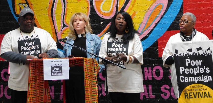 The PPC’s nationwide National Emergency Truth & Poverty Bus Tour hit Sacramento, and highlighted what it called the “true emergencies facing the nation’s 140 million poor and low-income people” – afterwards, about 50 people marched through the homeless areas that now almost dominate downtown Sacramento’s landscape.