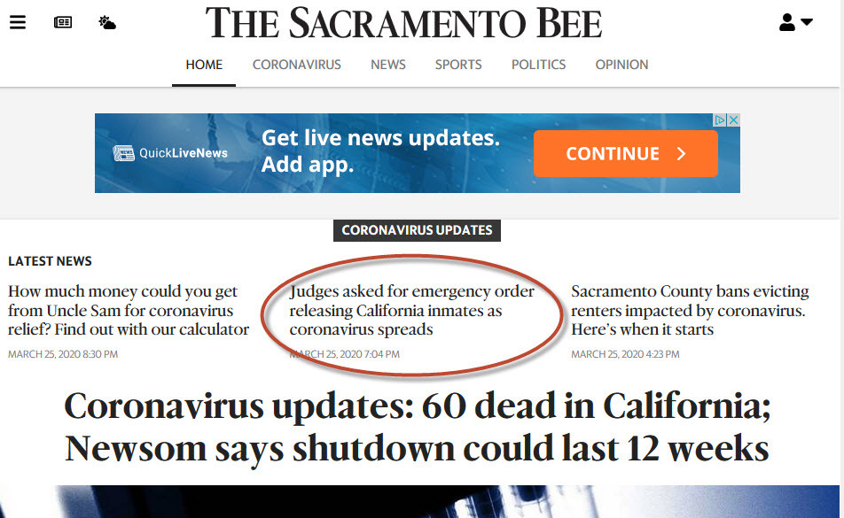 “Lawyers for California prison inmates asked a federal three-judge panel late Wednesday for an emergency order that could force state corrections officials to release thousands of inmates because of the coronavirus pandemic.”