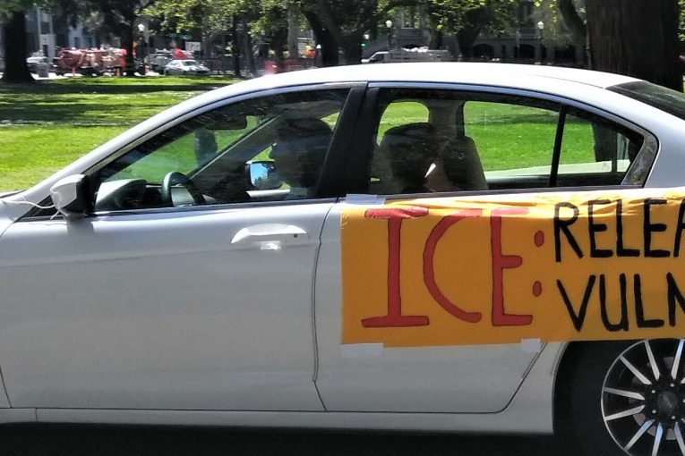 SACRAMENTO – COVID-19 could soon turn immigrant detention centers in California into “death camps,” warned more than 100 immigrant advocates tucked inside 50-placard emblazoned vehicles Tuesday as they circled the State Capitol as part of a multi-city, car-based direct action calling on the governor to free immigrants from the ICE centers.